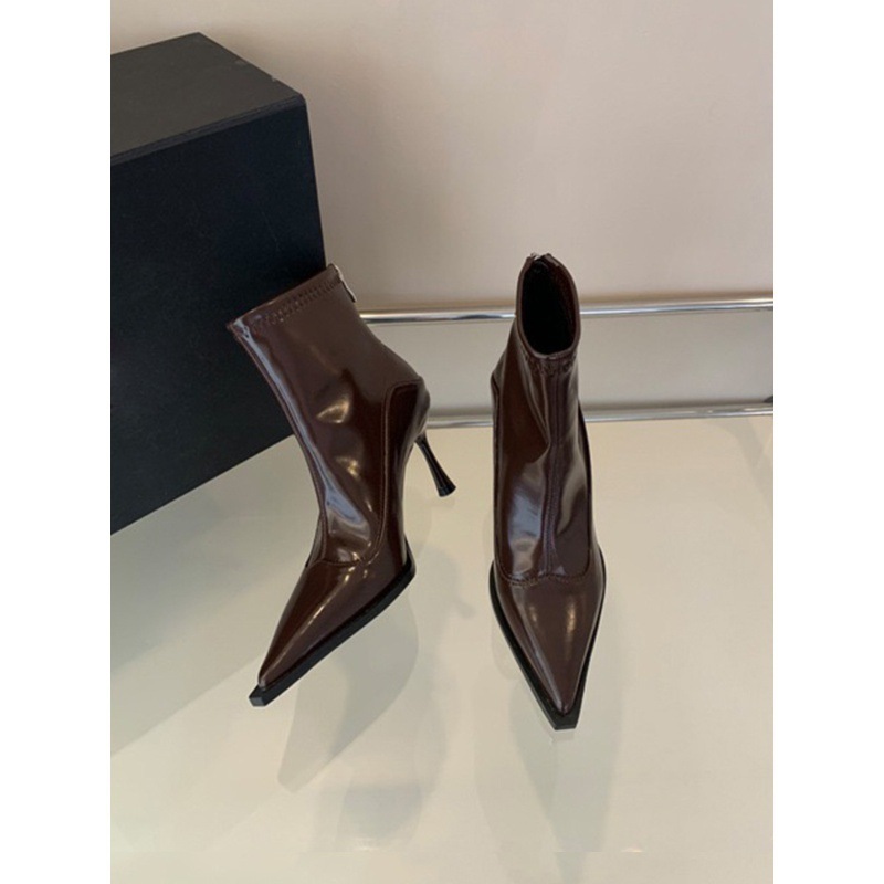 High -heeled pointed short boots in the autumn and winter of the year, fine -tier stitching naked boots, lean boots retro brown boots